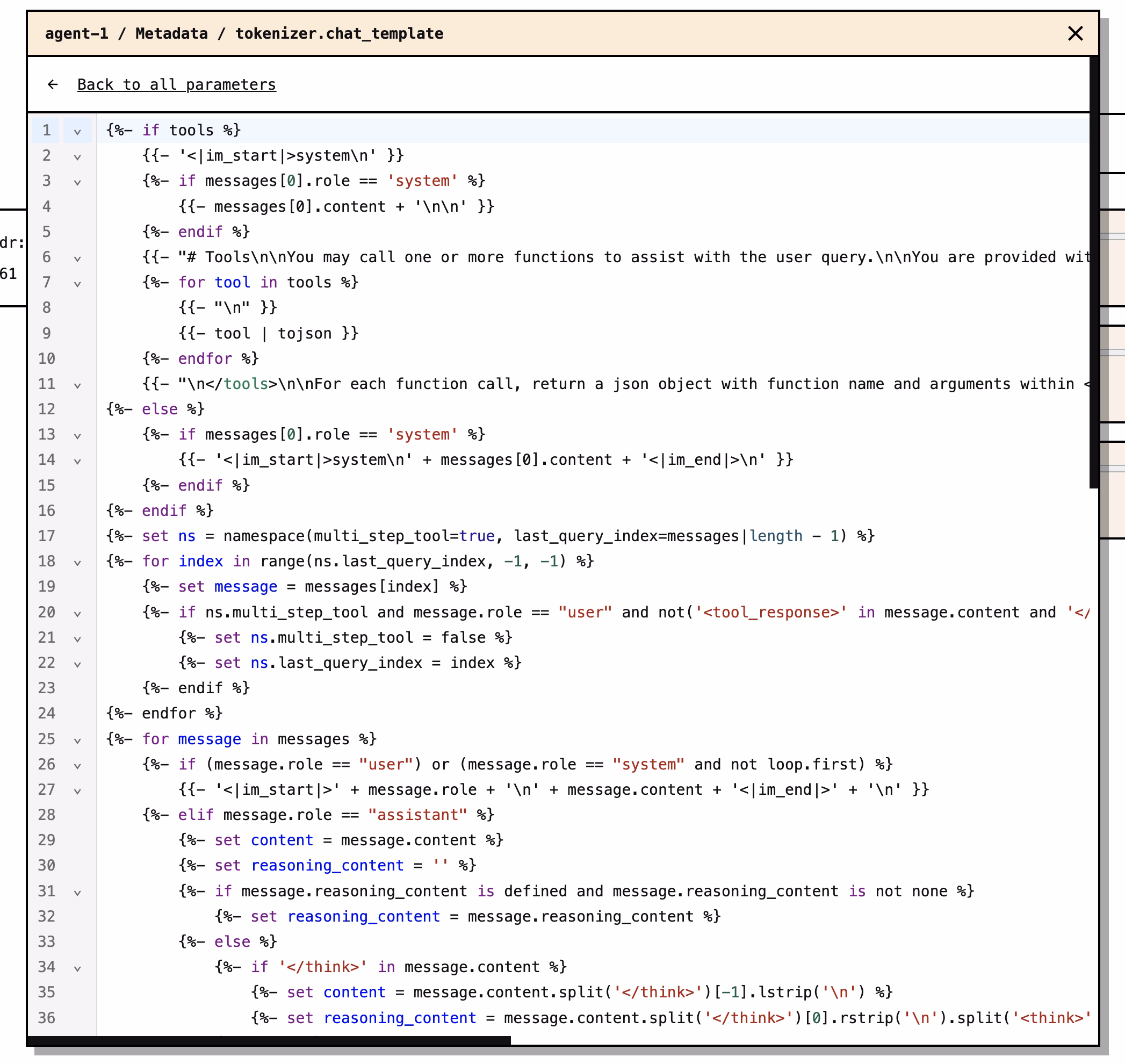First, we'll navigate to the model file's page on Hugging Face. You will see the chat template used by this model in the Metadata section: